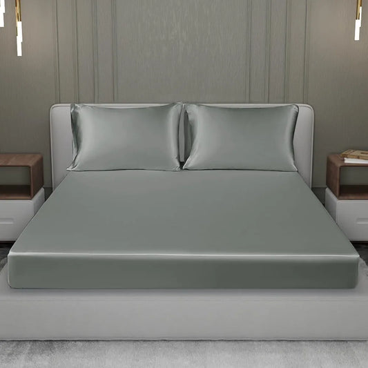 Cloth Fusion Satin Elastic Fitted Bedsheets Double Bed Luxury Queen Size with 2 Pillow Covers H603 280 TC Silver