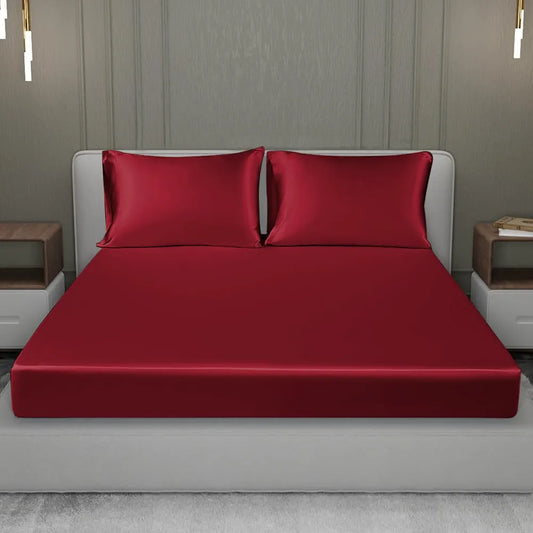 Cloth Fusion Satin Elastic Fitted Bedsheets Double Bed Luxury Queen Size Bed Sheet with 2 Pillow Covers Crimson Red