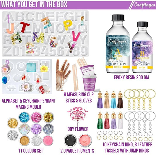 Craftinger Resin Art Pro Alphabet Keychain Making Kit With 200gm Epoxy Resin & Mould | Tassels Glitter Pigments and More