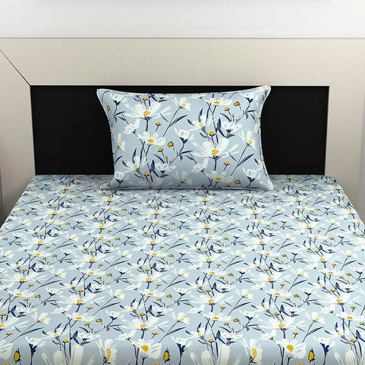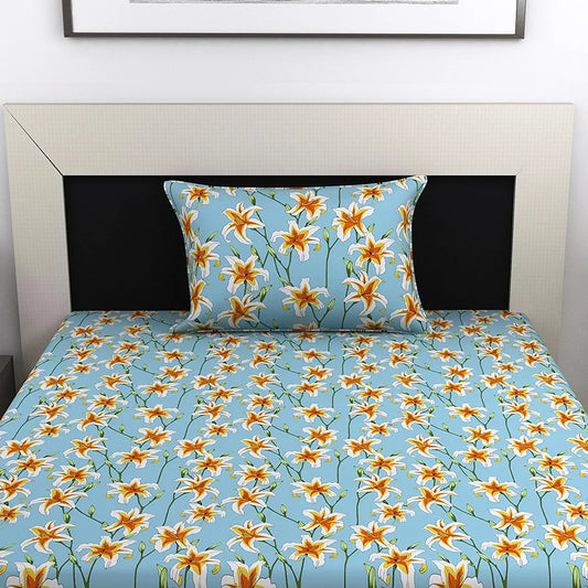 Divine Casa 100% Cotton Bedsheet for Single Bed, 144 TC Bedsheet Single Size Bed Cotton with 1 Pillow Cover Colour Aqua Bloom