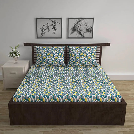 Divine Casa 144 TC 100% Cotton Bedsheet for Double Bed with 2 Pillow Cover Colour Teal & Yellow