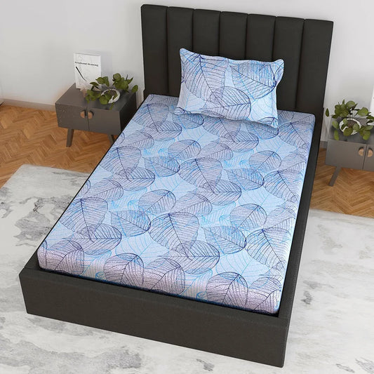 Divine Casa 144 TC Cotton Fitted Bedsheet for Double Bed Elegant Iris Print Dry Leaf Blue Elastic Fit with 2 Pillow Covers