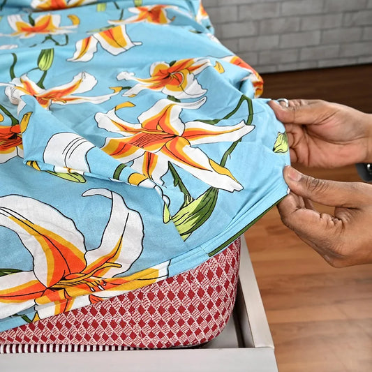 Divine Casa Floret 100% Cotton Double Fitted Bedsheet 144 TC Colour Wildflower Charm