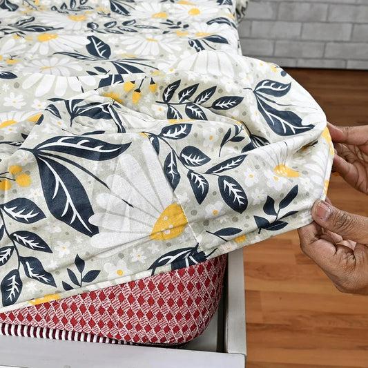 Divine Casa Floret 100% Cotton Double Fitted Bedsheet 144 TC Colour Vintage Daisies