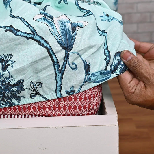 Divine Casa Floret 100% Cotton Double Fitted Bedsheet 144 TC Colour Water Orchid