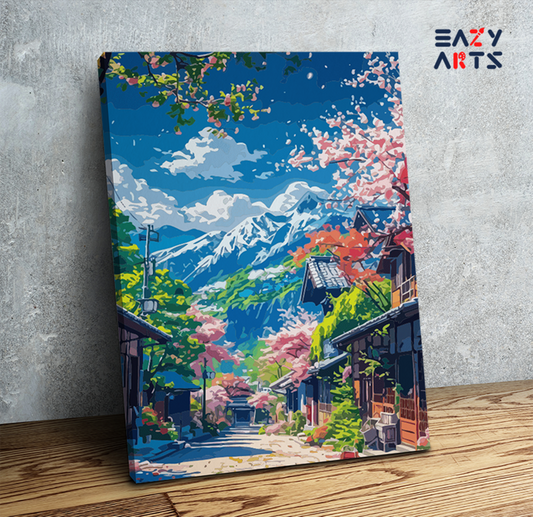 Eazy Arts Cherry Blossom Village with Mountain View Paint by Numbers Kit