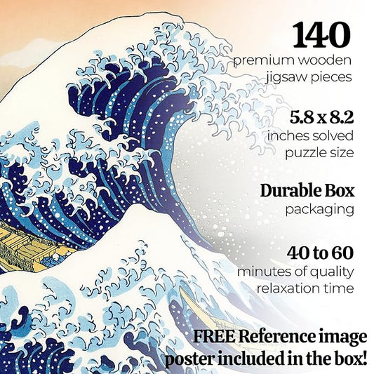 91knots Hokusai's the Great Wave Off Kanagawa Wooden Jigsaw Puzzle 140 Pieces for Adults and Kids | Japanese Ukiyo-e Artwork