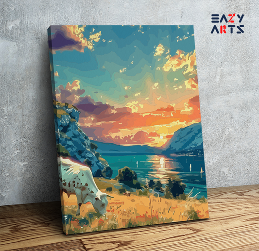 Eazy Arts Grazing Cow by Sunset Lakeside Paint by Numbers Kit