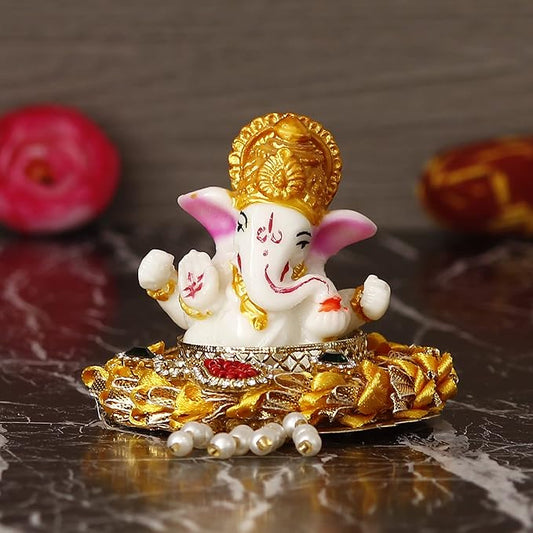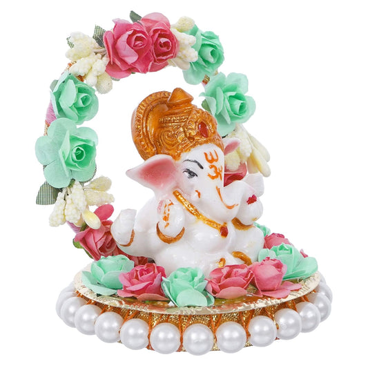 Ecraftindia Lord Ganesha Idol on Decorative Handcrafted Plate With Throne of Pink and Green Flowers