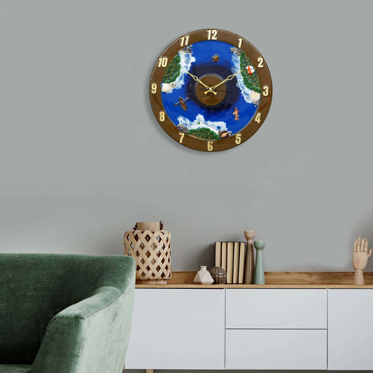 Exquisite Wooden Handmade Wall Clock Ocen Blue ith Green And White Printed Acrylic Wall Clock For Home (16 Inch)
