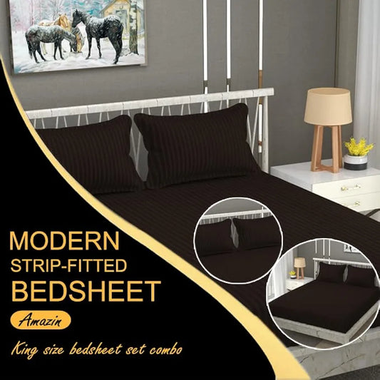 Fresh From Loom 240 TC Satin Striped Elastic Fitted Bed Sheets King Size Bed with Two Pillow Cover Multicolor Dark Coffee