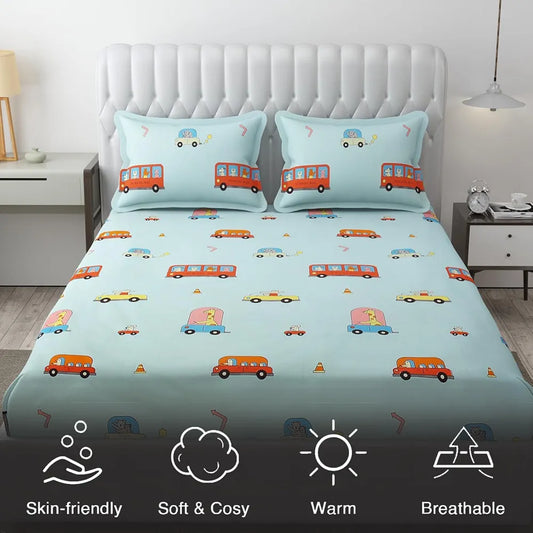 Fresh From Loom 300 TC Glace Cotton Soft Hypoallergenic Elastic Fitted Bed Sheet with 2 Pillow Cover Aqua Bus Queen