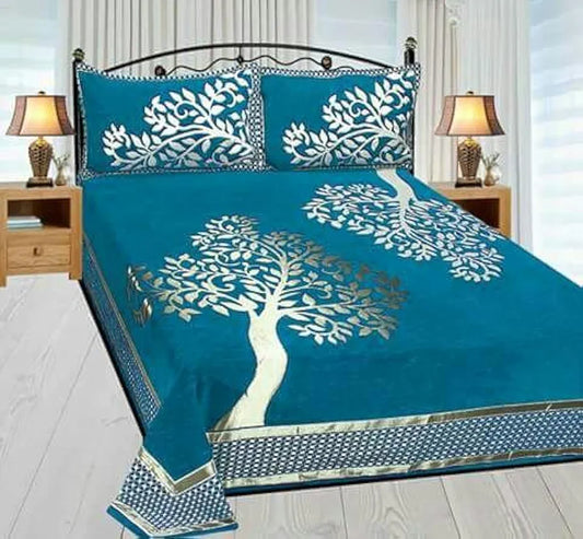 Fresh From Loom Chenille Velvet Floral 500 TC Heavy Bedsheet for Double Bed King Aqua Color with 2 Pillow Covers Tree SkyBlue
