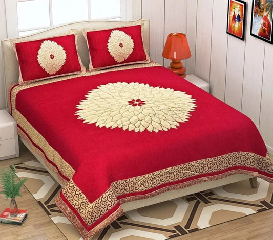 Fresh From Loom Chenille Velvet Floral 500 TC Heavy Bedsheet for Double Bed King Red Color with 2 Pillow Covers Dahila Red