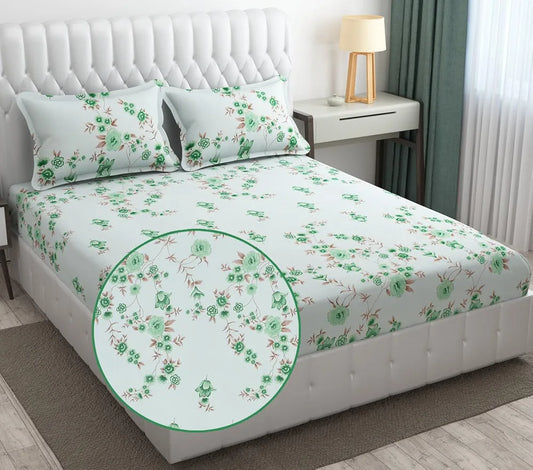 Fresh From Loom Floral Print 240 TC Microfiber Fitted King Size Bedsheet Set with 2 Pillow Cover Soft-Cyan