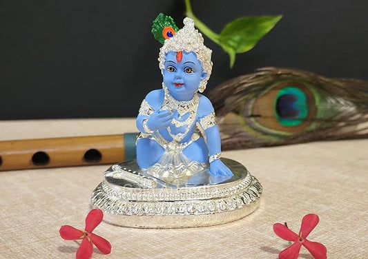 Gold Art India Ceramic Krishna Idol Standing Krishna Playing Basuri Flute Kanah JI Silver and Blue