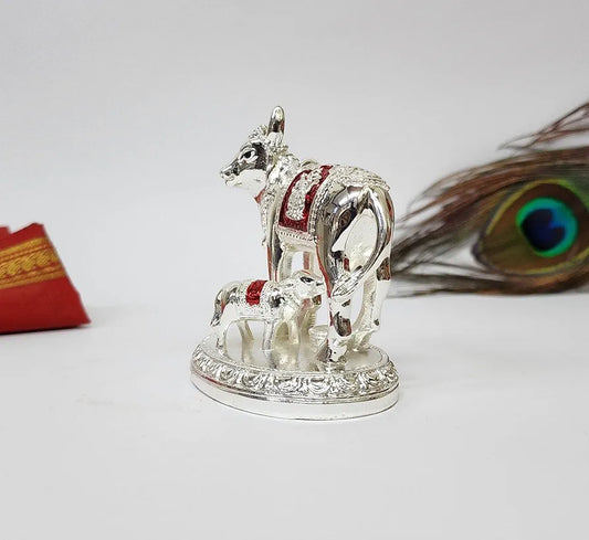 Gold Art India Kamdhenu Cow and Calf Idol with Red Accents Shiny Silver Finish | 7.62 cm
