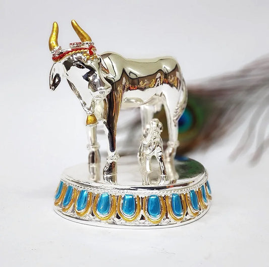Gold Art India Kamdhenu Cow with Calf 999 Silver Plated Plain Large Size