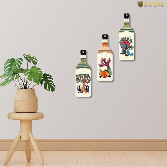 Artvibes Madhubani Art Wooden Wall Hanger for Home | Home Decor Hanging Items | Set of 3