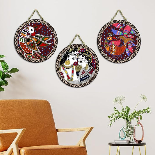 Artvibes Madhubani Art Wooden Wall Hanging Decoration Items for Home | Set of 3