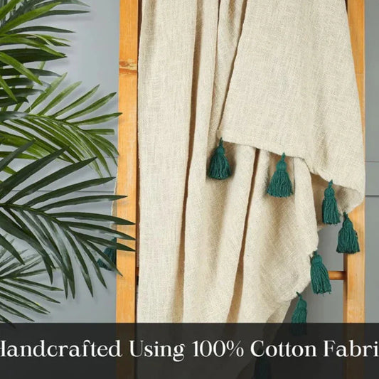Homadorn TC 250 100% Cotton Off White Throw Blanket with Handmade Colorful Tassel Colour Bottle Green
