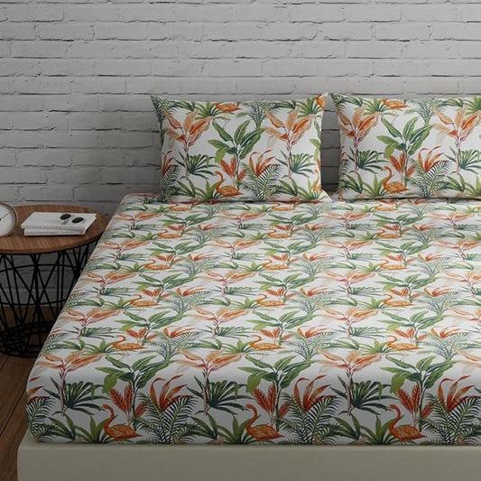 Huesland by Ahmedabad Cotton 144 TC Cotton Bedsheet for Double Bed King Size with 2 Pillow Covers | Flamingos Orange
