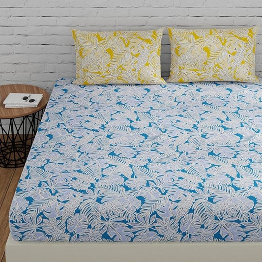 Huesland by Ahmedabad Cotton 144 TC Cotton Bedsheet for Double Bed King Size with 2 Pillow Covers | Blue & Yellow