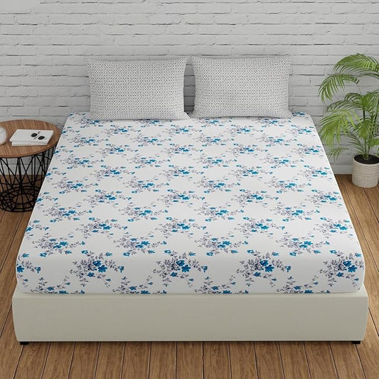 Huesland by Ahmedabad Cotton 144 TC Cotton Bedsheets for King Size Bed with 2 Pillow Covers | White (Blue Print)
