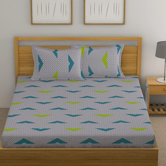 Huesland by Ahmedabad Cotton 144 TC Cotton King Size Bedsheet with 2 Pillow Covers - Light Grey, Blue & Green
