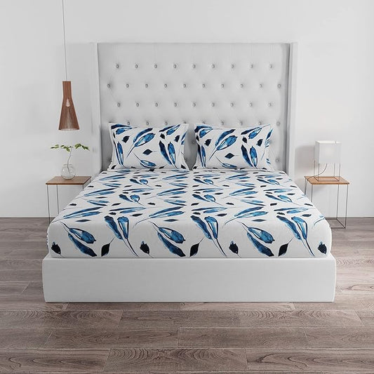 Huesland by Ahmedabad Cotton 144 TC Cotton King Size Bedsheet with 2 Pillow Covers - White & Blue
