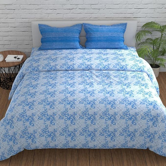 Huesland by Ahmedabad Cotton 144 TC King Size Bedsheet Cotton with 2 Pillow Covers | Grid | Blue, Grey & White