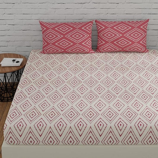 Huesland by Ahmedabad Cotton 144 TC King Size Bedsheet Cotton with 2 Pillow Covers | White & Peach Pink