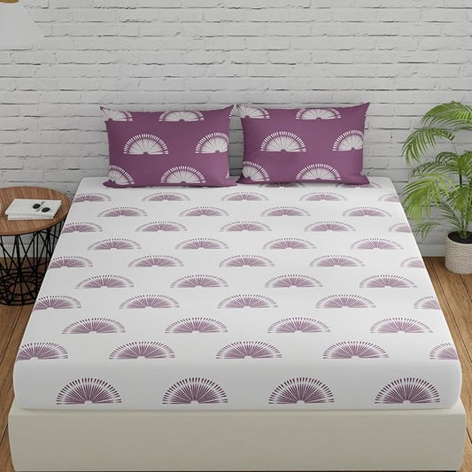 Huesland by Ahmedabad Cotton 144 TC King Size Bedsheet Cotton with 2 Pillow Covers | Sunrise | White & Grape Purple