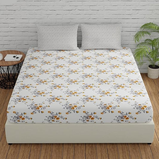 Huesland by Ahmedabad Cotton 144 TC King Size Bedsheet Cotton with 2 Pillow Covers | Yellow & Grey