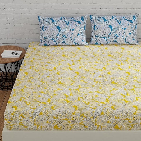 Huesland by Ahmedabad Cotton 144 TC King Size Bedsheet Cotton with 2 Pillow Covers | Yellow & Blue