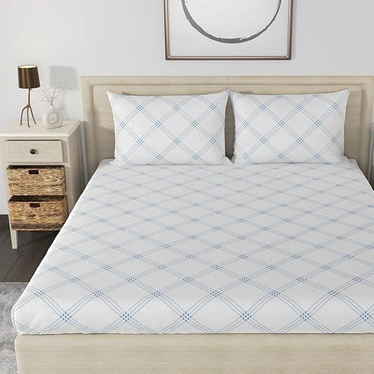 Huesland by Ahmedabad Cotton 186 TC Cotton Bedsheet for Double Bed King Size with 2 Pillow Covers | White (Blue Pattern)