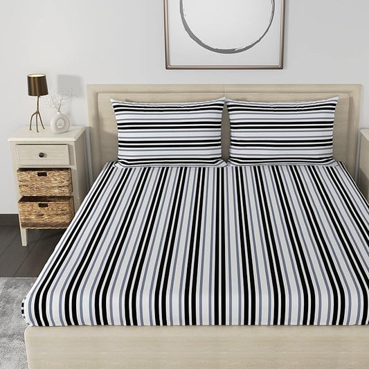 Huesland by Ahmedabad Cotton 186 TC King Size Bedsheet Cotton with 2 Pillow Covers | Stripes Black & Grey