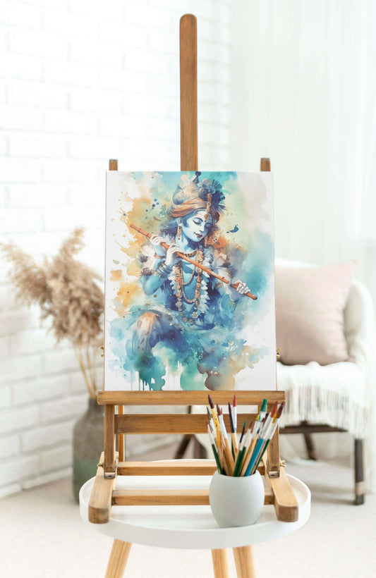 Krishna Playing Flute Abstract Canvas Poster Watercolor Look Wall Frame for Pooja Room