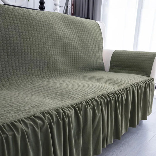 Kuber Industries Soft Velvet Quilted Single Seater Sofa Cover with Pocket Arms Frill Olive Green