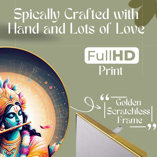 Lord Krishna Playing Flute Radiant Round Wall Art with Peacock Feather Golden Framed Large Painting Office