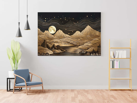 Luxury Golden Mountain Landscape Canvas Painting Modern Night Sky Wall Art with Moon & Stars for Home and Office Decor