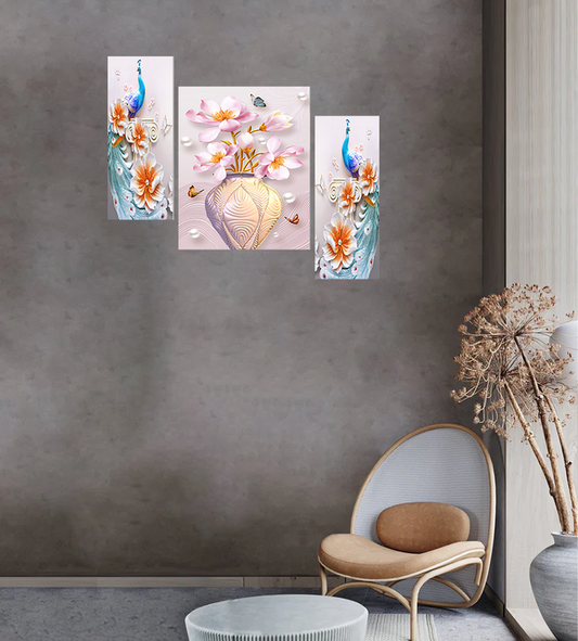 Majestic Beauty Ornate Vase with Flowers & Peacock 3 Pieces