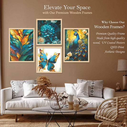 Nature’s Elegance Blue Wings & Blooming Gold Wall Frames Digital Wall Painting