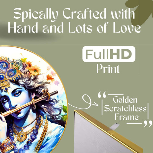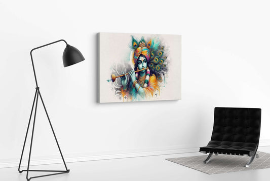 Peacock Feather Krishna Wall Painting HD Canvas Art with Flute Divine Home Decor Frame