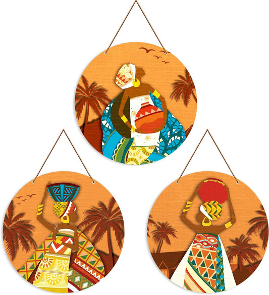 Tribal Women Wall Art Set of 3 African-Inspired Round Wooden Wall Hangings