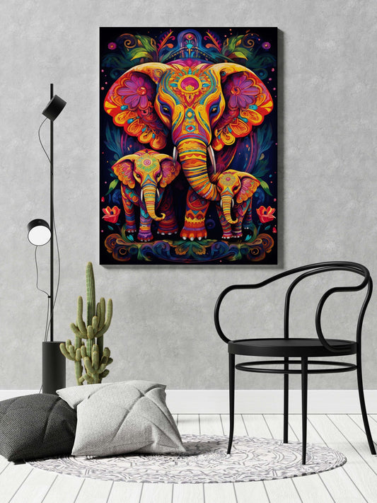 Vibrant Ethnic Elephant Canvas Painting Decorative Poster for Living Room & Meditation Corner