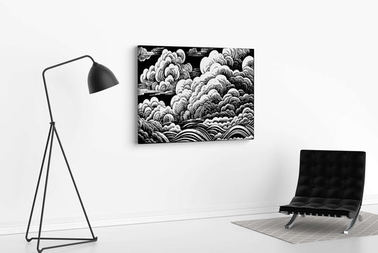 Vintage Black and White Cloudscape Canvas Painting Hand-Drawn Sky and Cloud Wall Art for Living Room Office & Studio Decor