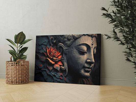 Buddha Face with Red Lotus Flower Modern Textured Wall Painting Framed Art for Home Decor