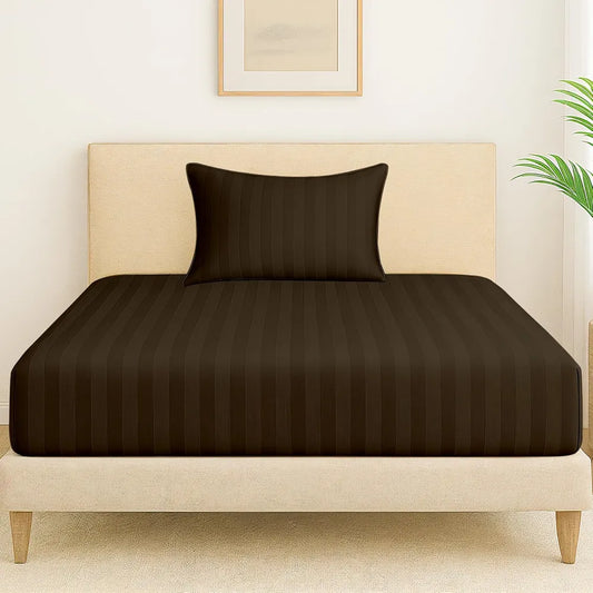 Cloth Fusion Elastic Fitted Glace Cotton Satin Striped Bedsheet Single Size with 1 Pillow Cover Dark Brown