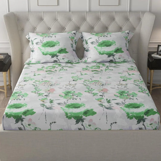 Cloth Fusion Glace Cotton Elastic Fitted Bedsheet for Double Bed King Size with 2 Pillow Covers Garden Mist